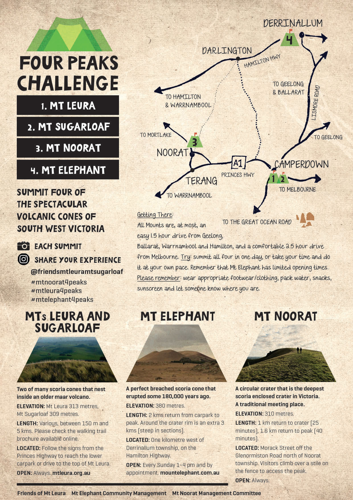 Summit four of the spectacular volcanic cones of South West Victoria Mt Leura, Mt Sugarloaf, Mt Noorat, Mt Elephant.